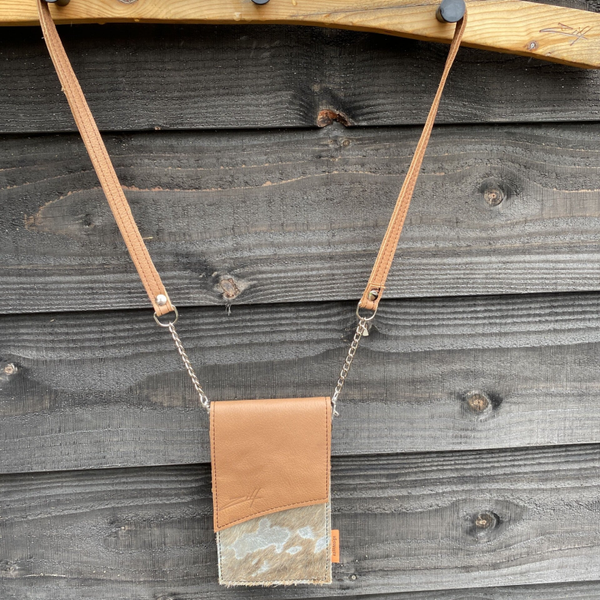 Handgemaakt leren telefoontasje Rome bruin en koeienhuid met zilver