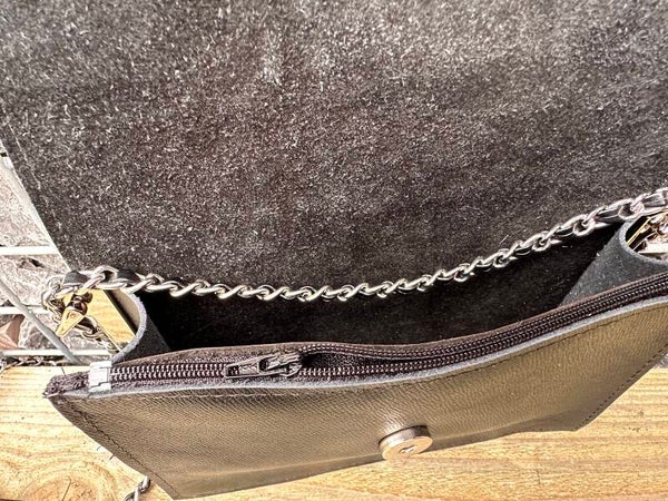 Het hengsel van de tas is een combinatie van een lang stukje leer met ketting, zodat de tas cross body gedragen kan worden.