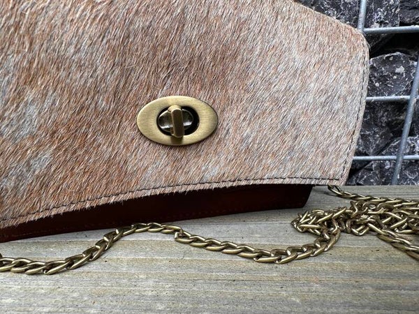 Deze tas is afgewerkt met bronskleurige ketting en een crèmekleurig handvat. Een echte eyecather!