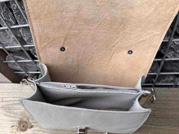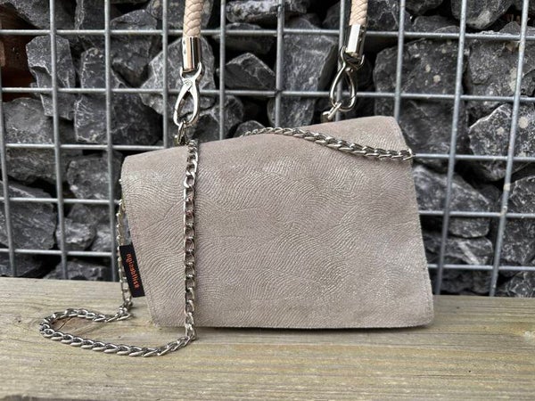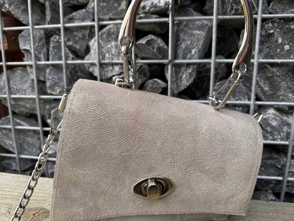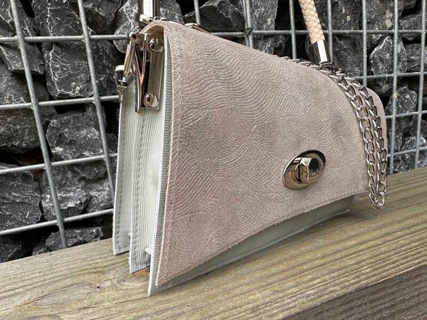 Deze tas is gemaakt van prachtig lichtbeige leer in combinatie met een leer met golvend motief en glinster. Het is lastig uitleggen, maar door in te zoomen op de foto's zie je het resultaat.