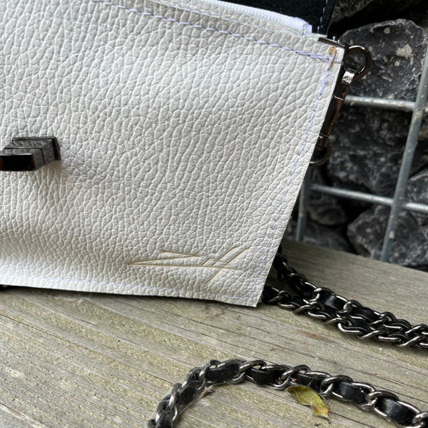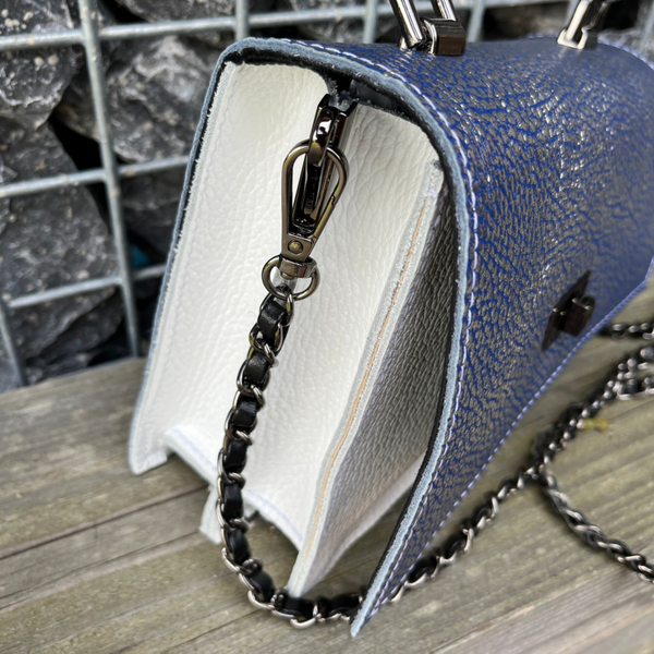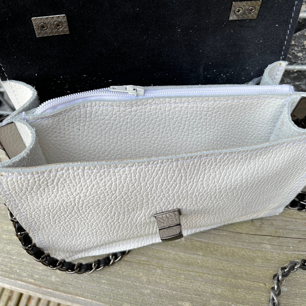 Deze tas is afgewerkt met gevlochten ketting en een zilverkleurig handvat.
