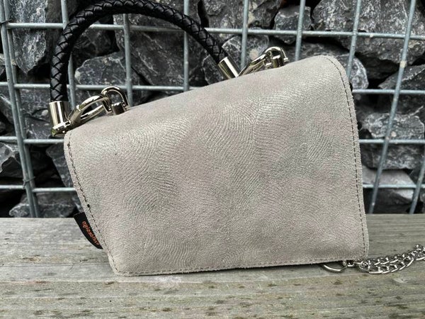 Deze tas is afgewerkt met gevlochten ketting en een zwartkleurig handvat.