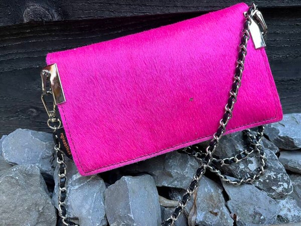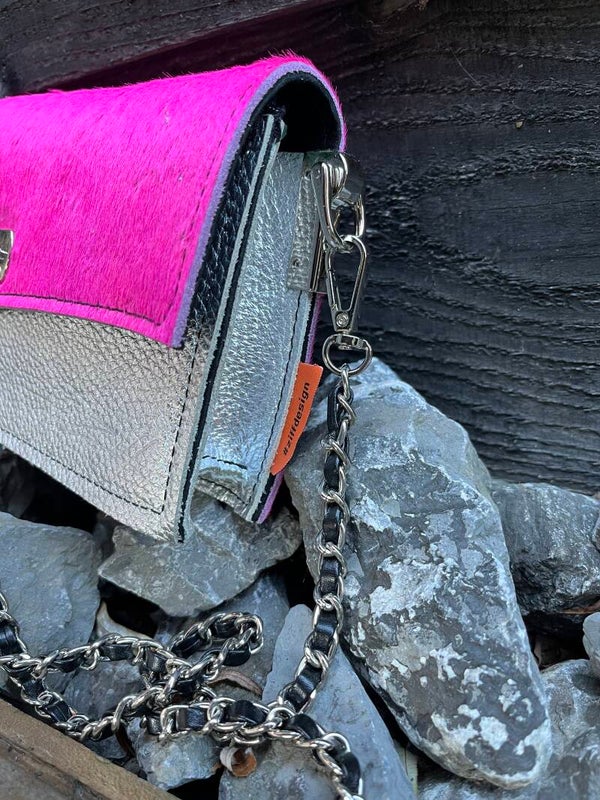 Deze tas is gemaakt van fantastische kwaliteit leer en huid. De klep is van een fuchsia roze kleur in combinatie met zilver leer.