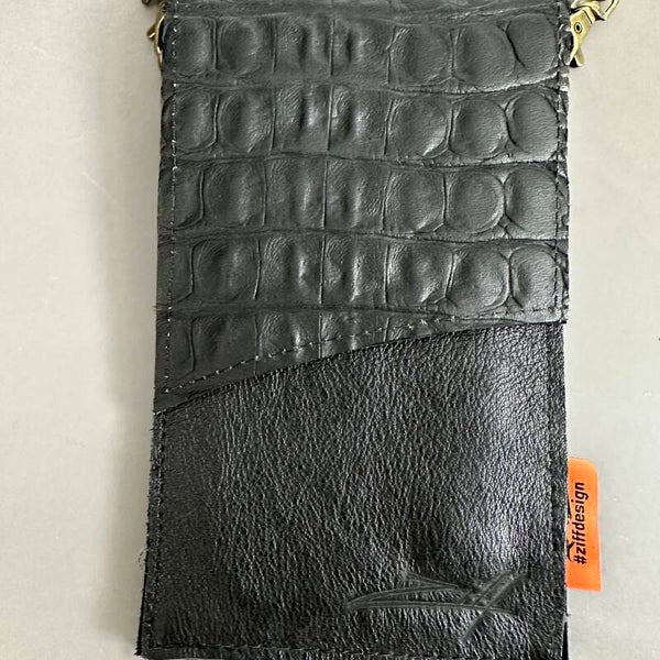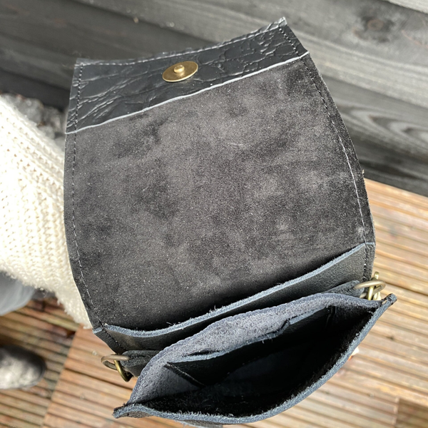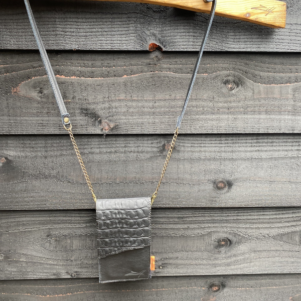 De klep is gemaakt van zwart croco leer en de basis is van glad zwart leer