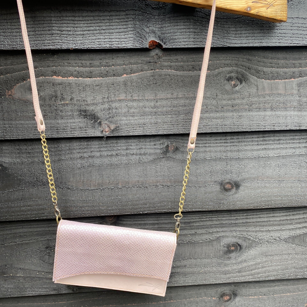 Het hoge model Lucca is ook weer een prachtig exemplaar. Je hebt net iets meer ruimte voor bijvoorbeeld een zonnebril of leesbril. De klep heeft een roze croco print en de basis van de tas is gemaakt van roze glad leer. De ziff details, zoals het oranje tag en de schuine klep, zijn uiteraard aanwezig. Het hengsel van de tas is gedeeltelijk met ketting en leren riempje. De tas is over de schouder en cross body te dragen.