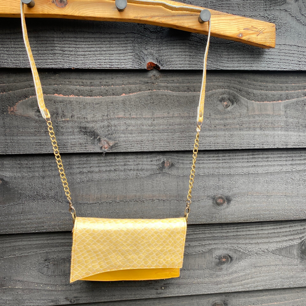 Het hoge model Milaan is ook weer een prachtig exemplaar. Je hebt net iets meer ruimte voor bijvoorbeeld een zonnebril of leesbril. De klep heeft een gele croco print en de basis van de tas is gemaakt van geel glad leer. De ziff details, zoals het oranje tag en de schuine klep, zijn uiteraard aanwezig. Het hengsel van de tas is gedeeltelijk met ketting en leren riempje. De tas is over de schouder en cross body te dragen.